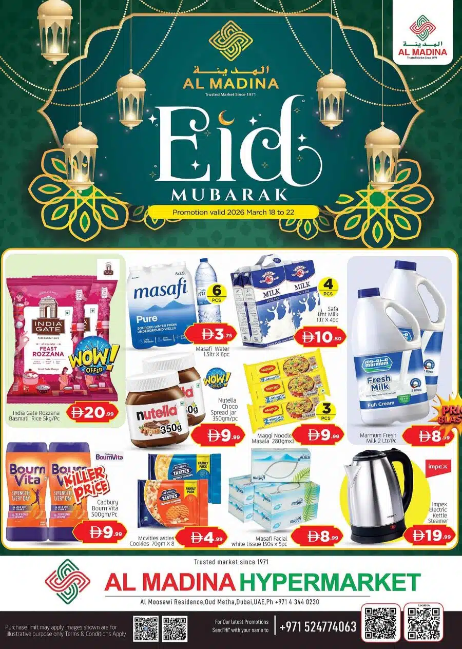 View the Al Madina Oud Metha offers ; Eid Promotional leaflet, valid from 18 Mar – 22 Mar 2026 Al Madina Oud Metha – Best Weekly Savings ↑ Click to Browse Catalog More about Al Madina Hypermarket UAE – Location & Details View Similar Leaflets West Zone KM Trading Al Madina Grandiose Follow our Channels WhatsApp Telegram Facebook Instagram