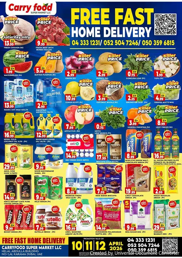 View the latest Carry Food Supermarket offers ; Weekend Promotion valid from 10-12 April 2026. Carry food Supermarket Catalog – Best Weekly Savings ↑ Click to Browse Catalog More about Carry food UAE – Location & Details View Similar Leaflets West Zone KM Trading Al Madina Grandiose Follow our Channels WhatsApp Telegram Facebook Instagram