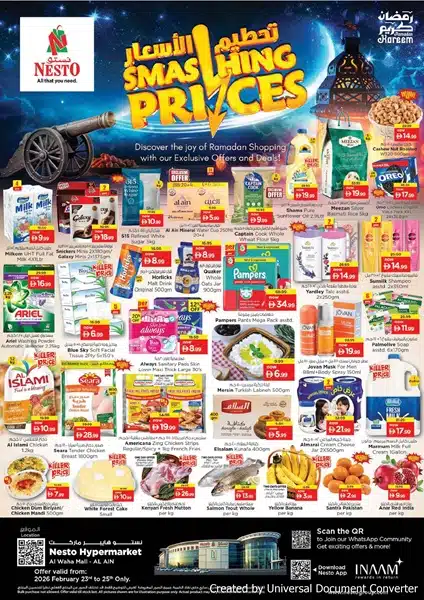 View the latest Nesto Al Ain Offers ; Smashing Prices offer, valid from 23rd Feb to 25th Feb 2026 Latest Nesto Al Ain Offers & Weekly Promotions ↑ Click to Browse Catalog More about Nesto UAE – Location & Details View Similar Leaflets Safa Express KM Trading Choithrams Carrefour Follow our Channels WhatsApp Telegram Facebook Instagram